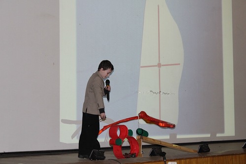 На основной сцене ДК Метролог наши четвероклассники представили свои проекты по выращиванию кристаллов. А Гундырев Андрей, ученик 2-Б класса, рассказал о том, как важно знать физику, и показал свои проекты, демонстрирующие такое явление, как центр тяжести тела.