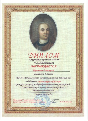 Премия конкурса имени В.Н. Татищева в номинации "Физика" 2016 год